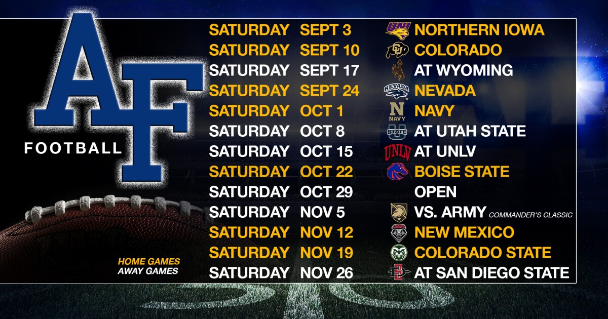 Source : www.koaa.comUsafa 2024 Football Schedule Season MOUNTAIN WEST ANNOUNCES 2024 FOOTBALL MATCHUPS Air Force Academy : Football schedules for the 2024 season are starting to be announced all across the Sunshine State and SBLive Sports Florida will share these as we see them.Recently, the Barron Collier Cougars . All you need to know for the 2024 NCAA rifle championships, including championship schedule, time, information and more. .